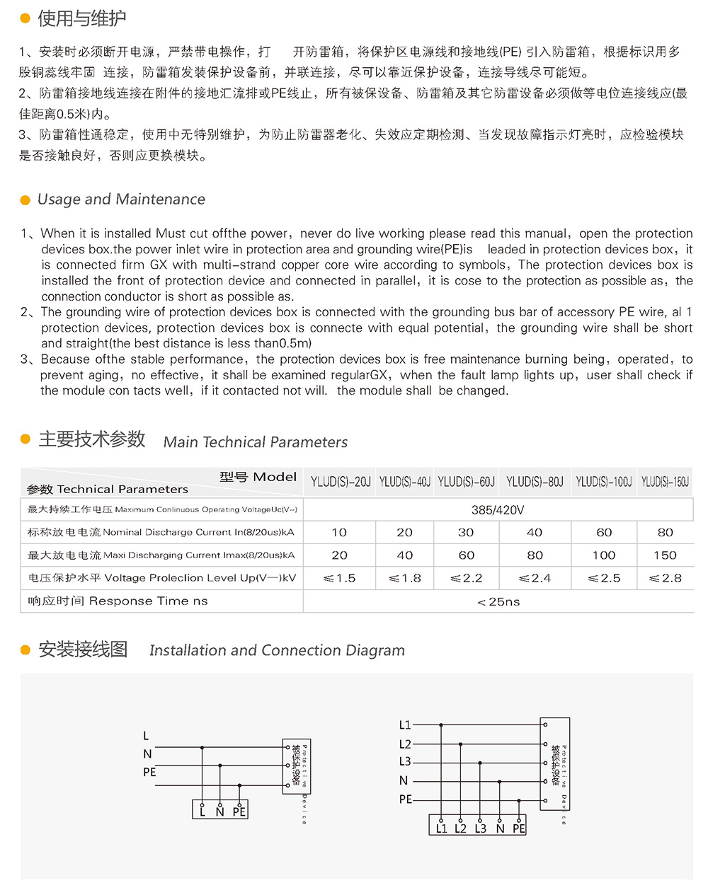 单、三相交流电源防雷箱适用于B、C、D级过电压保护,主要安装在室内低压配电柜(箱)处,当电源线路产生操作过电压或雷击的过电压时,防雷箱能立即在纳秒级的时间内迅速导通,将过电压的幅值限制在设备的安全工作范围内,同时将过电压的能量泄入在地。