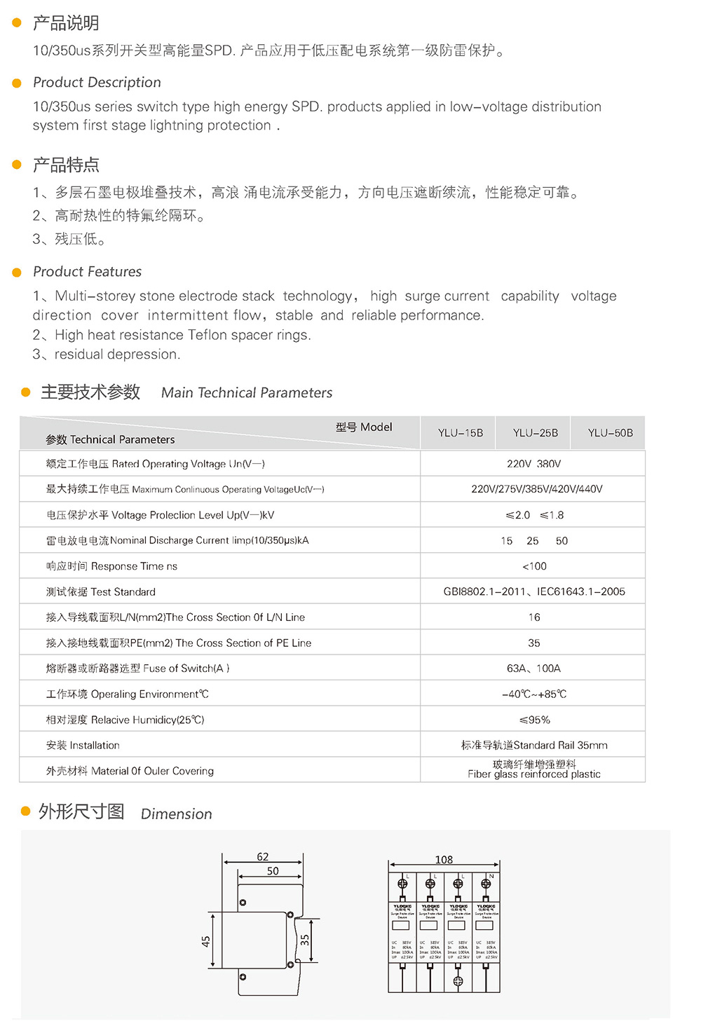 6系列1级电涌保护器(简称SPD)适用于交流50/60Hz,380V及以下的TN-S、TN-C-S、TT、IT等供电系统,可作为LPZ1、LPZ2与LPZ3区界面处的等电位连接,其设计依据符合IEC61643-1、GB18802.1, 外壳设计安装在35mm电气导轨上,该产品内置失效脱离装置。当电涌保护器因过流过热,击穿失效时,失效脱离装置能自动的将其从电网上脱离,同时可视告警指示绿色(正常)、红色(故障),模块可在有工作电压情况下更换。