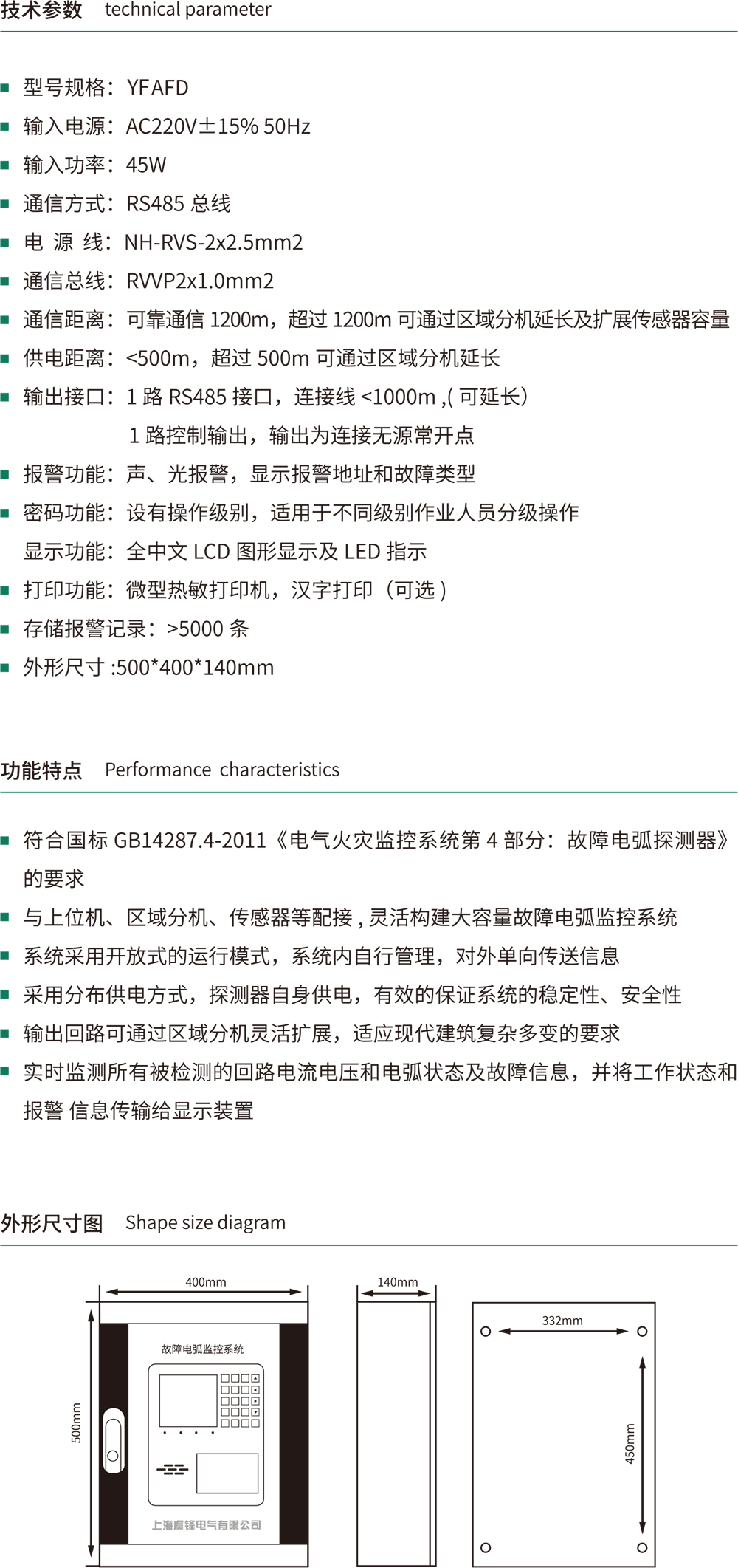 产品特点:符合国标GB14287.4-2011《电气火灾监控系统第4部分:故障电弧探测器》的要求与上位机、区域分机、传感器等配接,灵活构建大容量故障电弧监控系统系统采用开放式的运行模式,系统内自行管理,对外单向传送信息采用分布供电方式,探测器自身供电,有效的保证系统的稳定性、安全性输出回路可通过区域分机灵活扩展,适应现代建筑复杂多变的要求实时监测所有被检测的回路电流电压和电弧状态及故障信息,并将工作状态和报警信息传输给显示装置