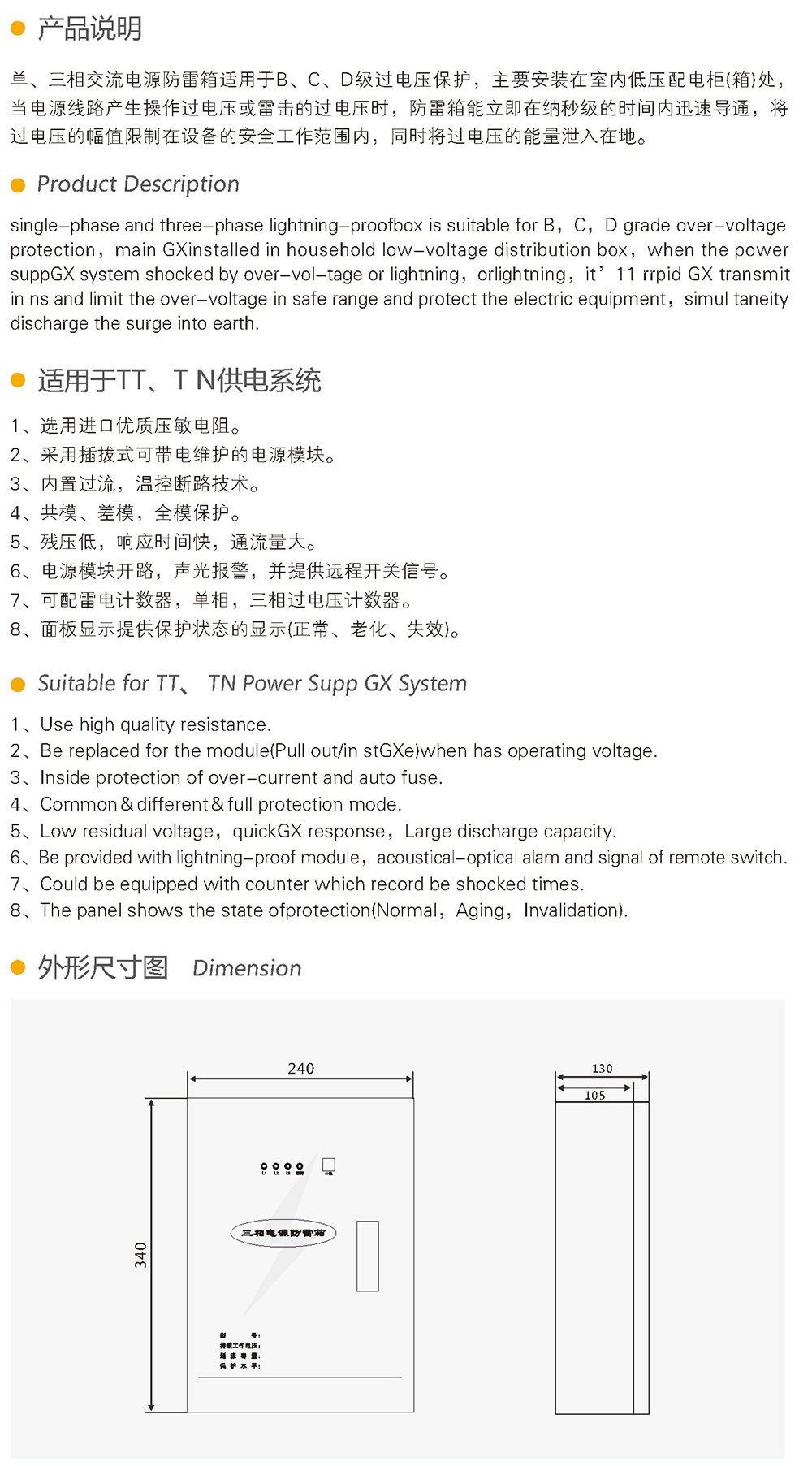 单、三相交流电源防雷箱适用于B、C、D级过电压保护,主要安装在室内低压配电柜(箱)处,当电源线路产生操作过电压或雷击的过电压时,防雷箱能立即在纳秒级的时间内迅速导通,将过电压的幅值限制在设备的安全工作范围内,同时将过电压的能量泄入在地。