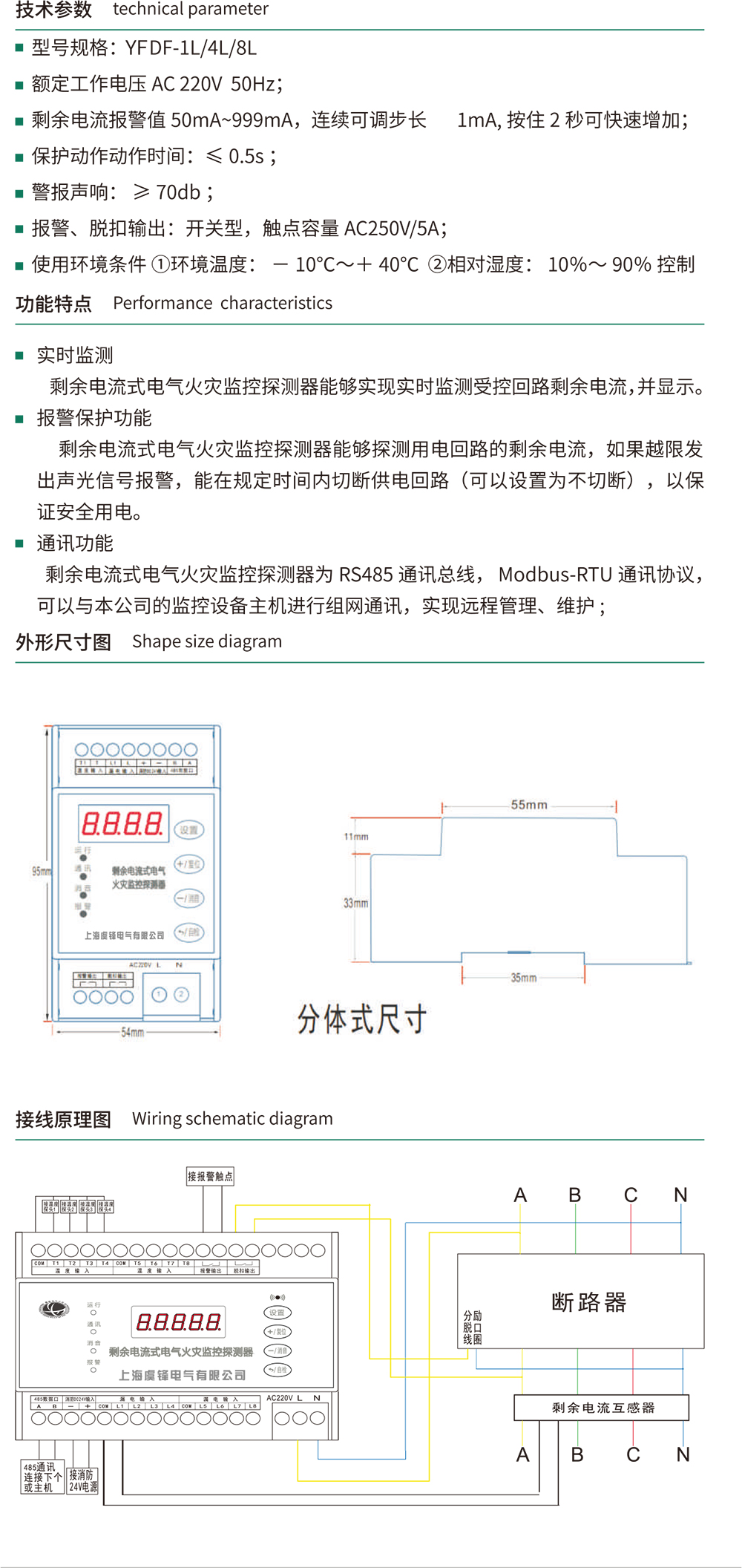 产品特点:实时监测剩余电流式电气火灾监控探测器能够实现实时监测受控回路剩余电流,并显示。报警保护功能剩余电流式电气火灾监控探测器能够探测用电回路的剩余电流,如果越限发;出声光信号报警,能在规定时间内切断供电回路(可以设置为不切断),以保证安全用电。通讯功能剩余电流式电气火灾监控探测器为RS485通讯总线,Modbus-RTU 通讯协议,可以与本公司的监控设备主机进行组网通讯,实现远程管理、维护;