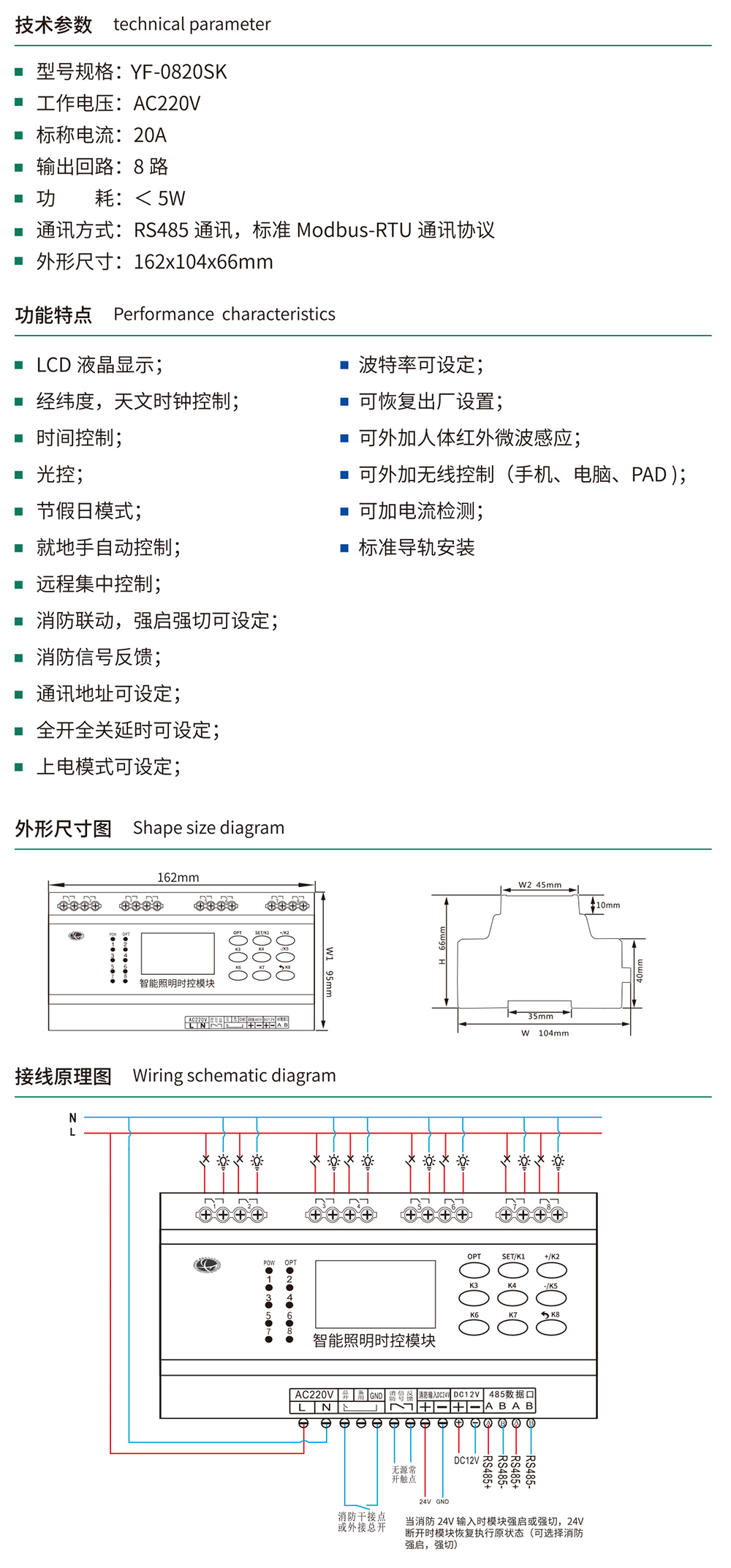 LCD液晶显示;波特率可设定;经纬度,天文时钟控制;可恢复出厂设置;时间控制;可外加人体红外微波感应;光控;可外加无线控制(手机、电脑、PAD);节假日模式;可加电流检测; 就地手自动控制;标准导轨安装远程集中控制;消防联动,强启强切可设定;消防信号反馈;通讯地址可设定;全开全关延时可设定;上电模式可设定;